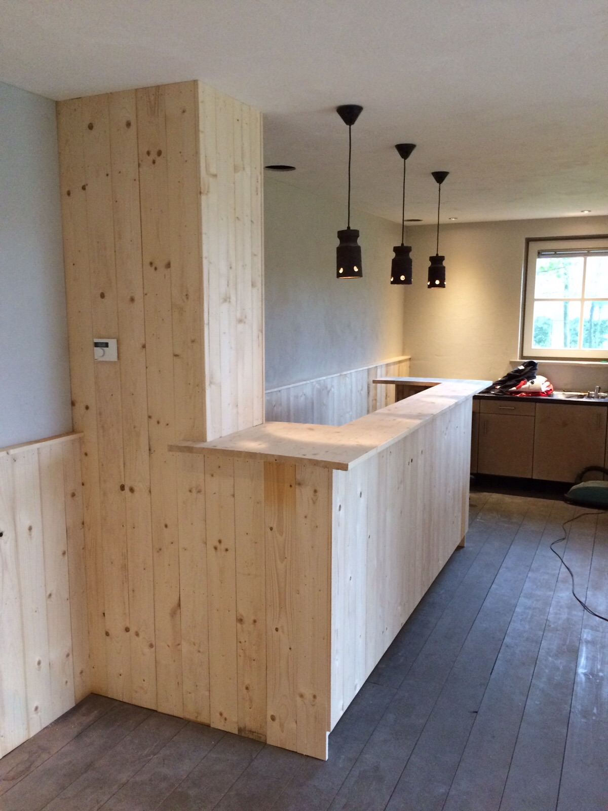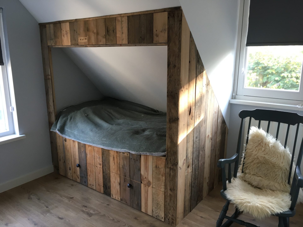 Op maat gemaakte bedstee met 2 lades, loungeset en bar.